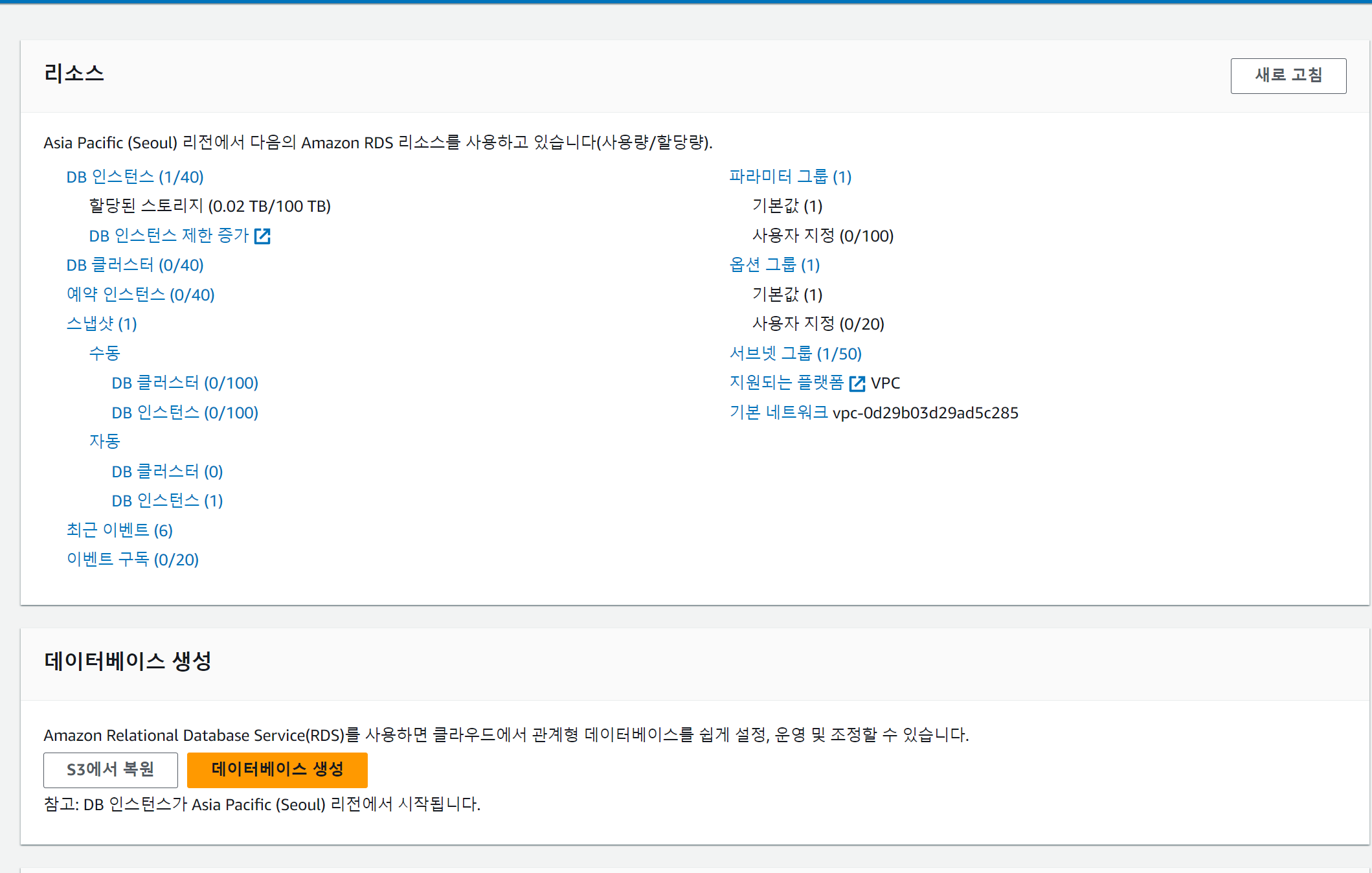 아래처럼 DB가 생성된다. 그런데 생성 까지 몇 분 걸린다.