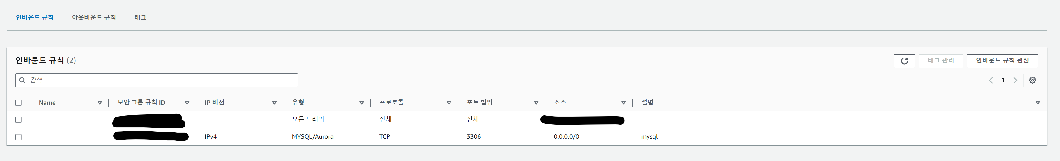 인바운드 규칙에 들어가서 밑에 적혀있는 IPv4 MySQL을 아래처럼 설정해주자.