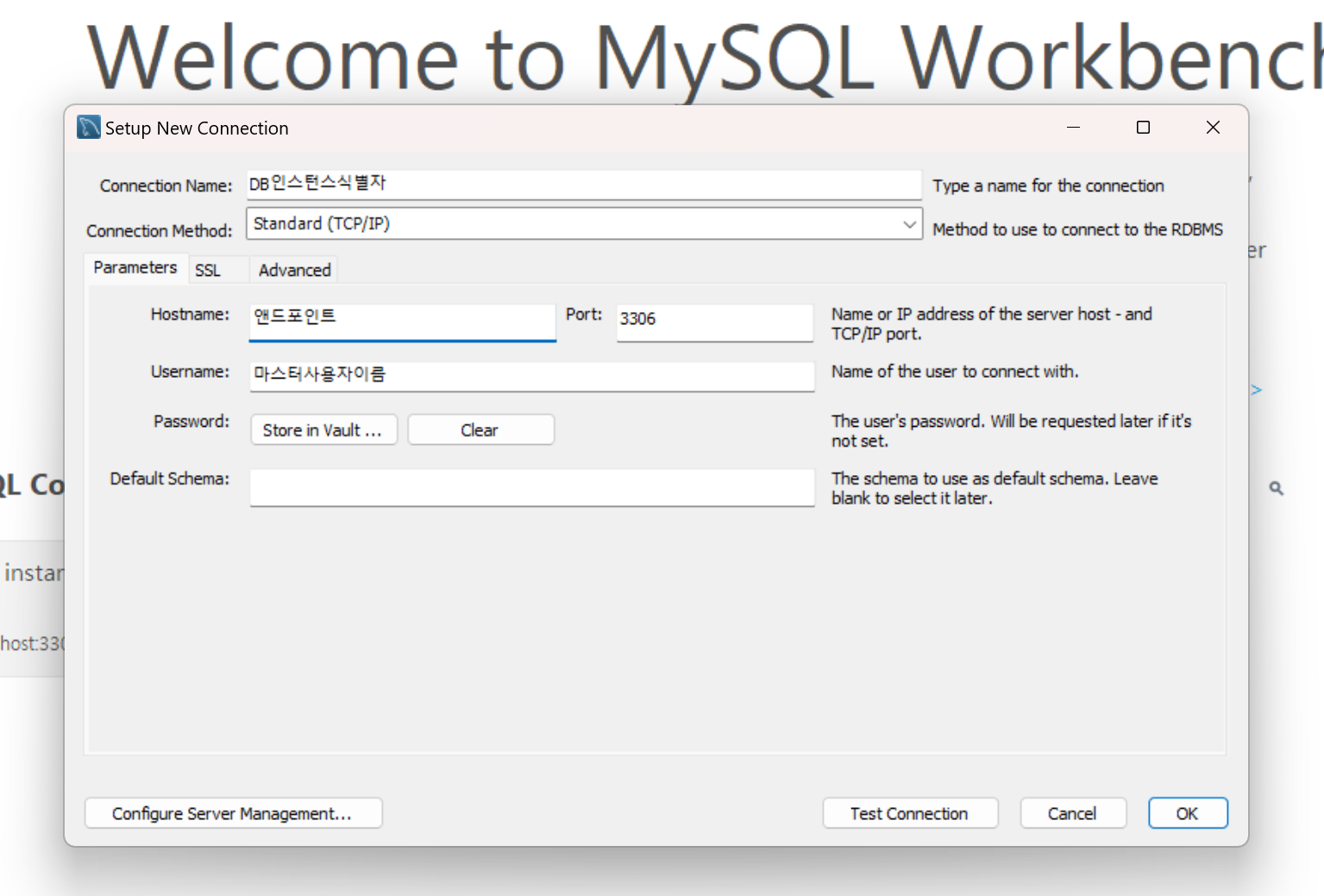 이제 mysql workbench에 들어가서 아래처럼 하고 store in vault ... 에서 아까 만든 비밀번호도 입력하고, Test Connection 버튼을 눌러주자.
