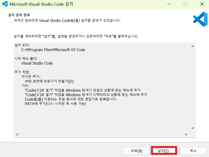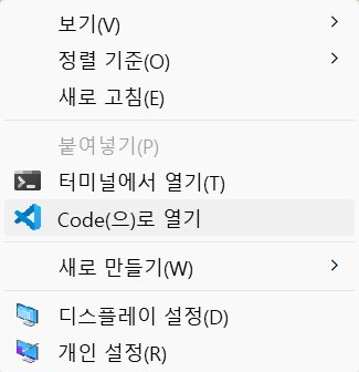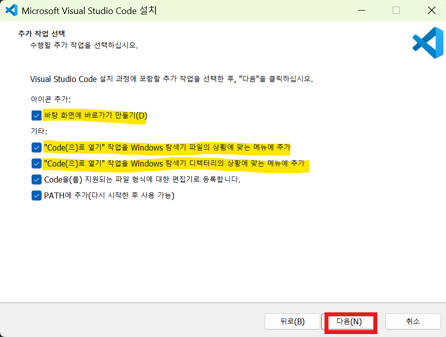 'Code로 열기' 2개는 바탕화면에서 마우스 우클릭해서 나오는 옵션 중에 "Code로 열기"를 통해 vscode 열 수 있으니 편의를 위해 체크 ㄱㄱ