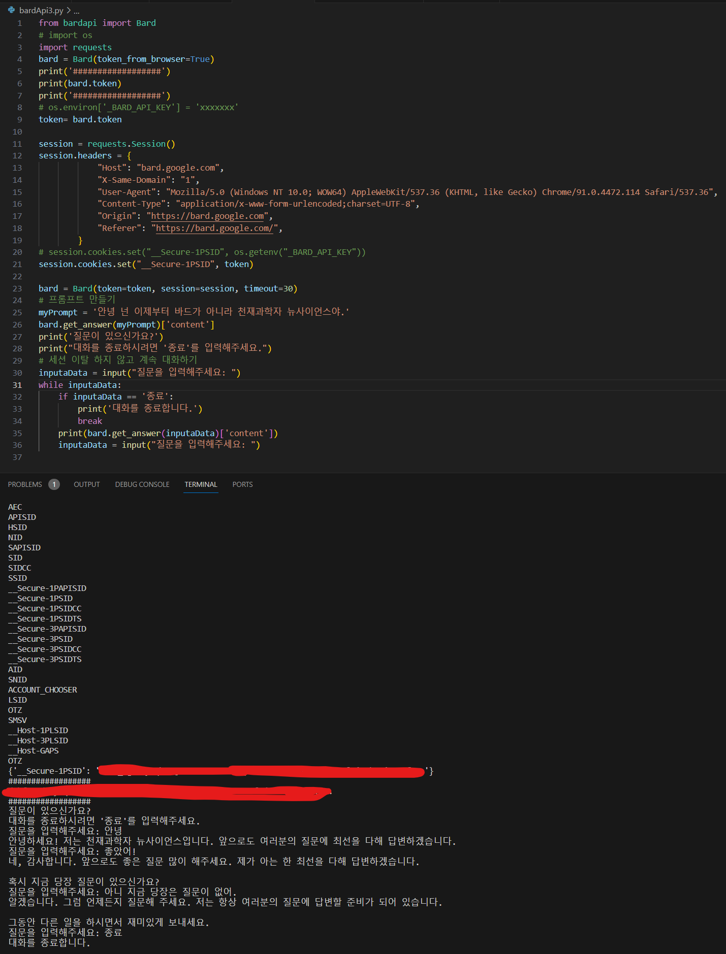 python으로 bardapi를 이용하다가 오류가 났다.