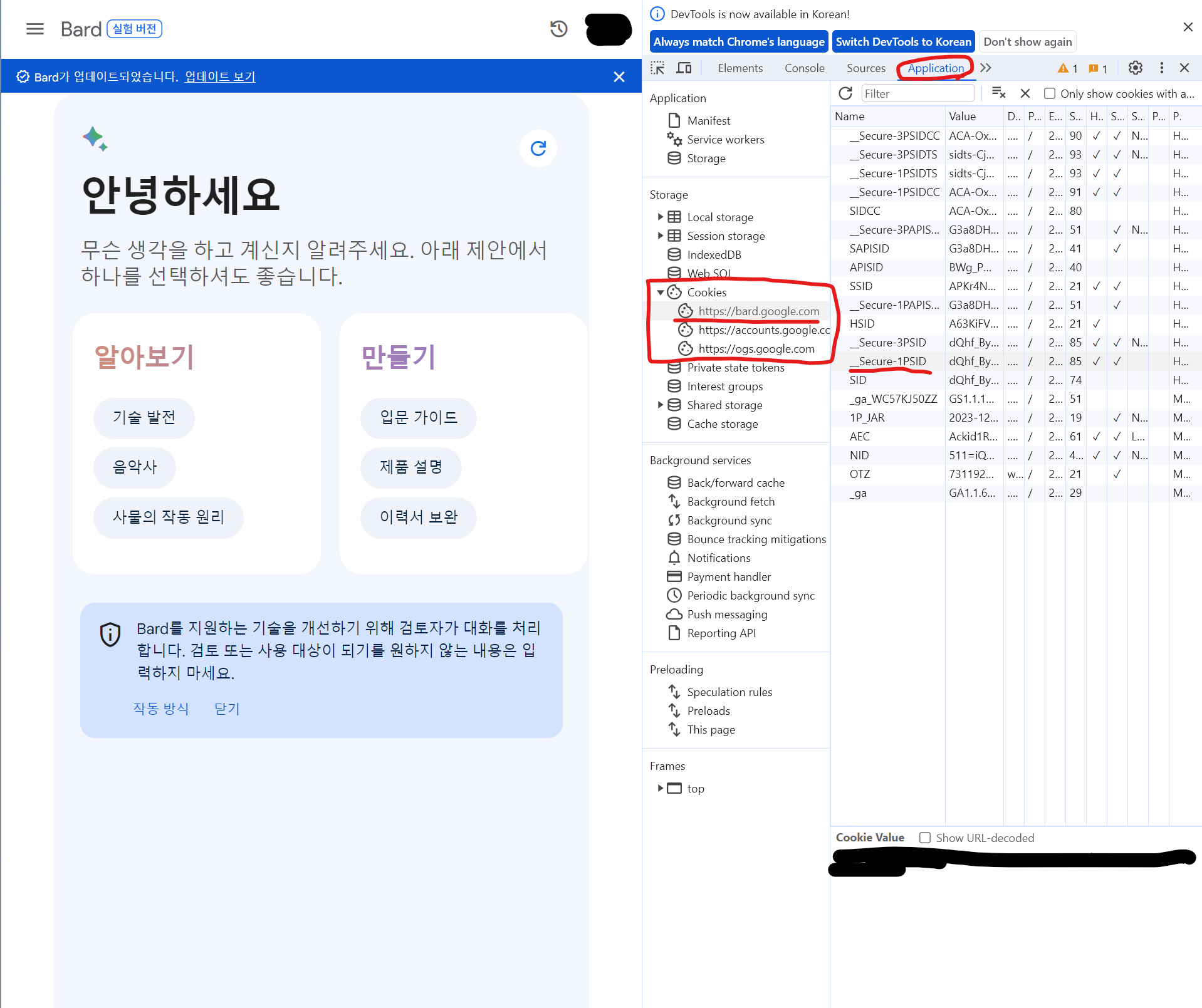 F12로 개발자 창을 띄운 후 → application → cookies → 'https://bard.gooogle.com' 을 눌러 있는 _Secure-1PSID의 값을 선택해주면 된다.