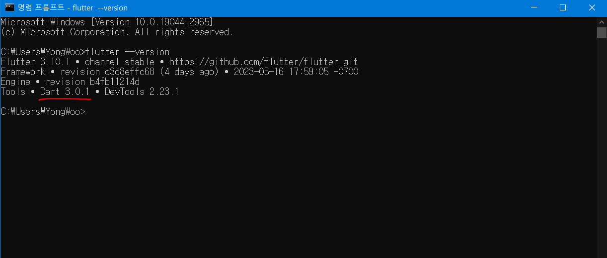 만약 여기 dart의 버전이 2.x.x라면 업그레이드가 필요하다.