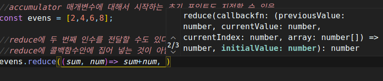 evens.reduce((sum, num)=> sum+num, 여기에 초기값을 설정해줌)