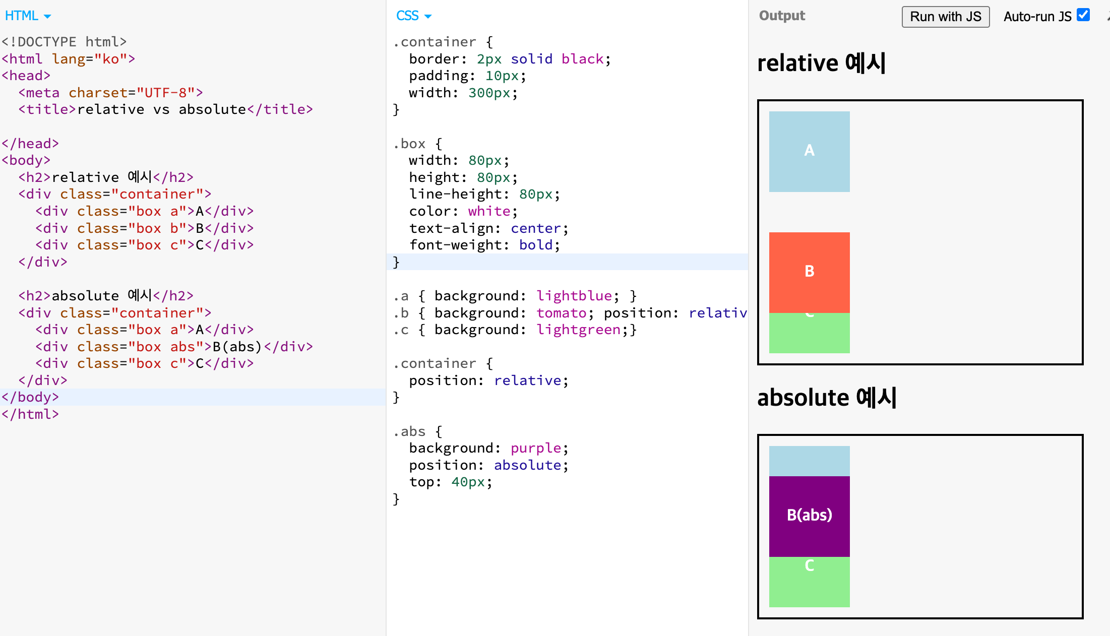 | absolute | flow에서 제거, 조상 요소 중 position이 static이 아닌 요소 기준 배치 |