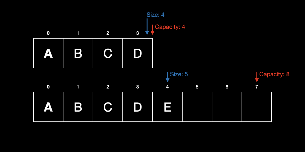 동적 배열는 정적 배열의 가장 큰 단점인 고정된 크기(size)를 보안하고자 고안된 자료구조로서, 용량(capacity)의 개념을 적용해 한계를 극복했다.