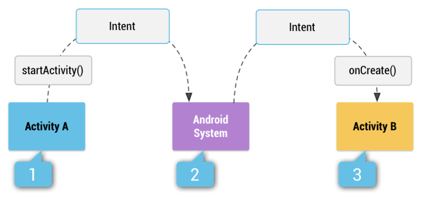 1. Activity A가 작업 설명이 들어있는 Intent를 생성하여 startActivity() 에 전달한다.