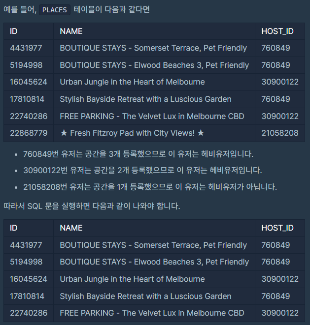 이 서비스에서는 공간을 둘 이상 등록한 사람을 "헤비 유저"라고 부릅니다. 헤비 유저가 등록한 공간의 정보를 아이디 순으로 조회하는 SQL문을 작성해주세요.