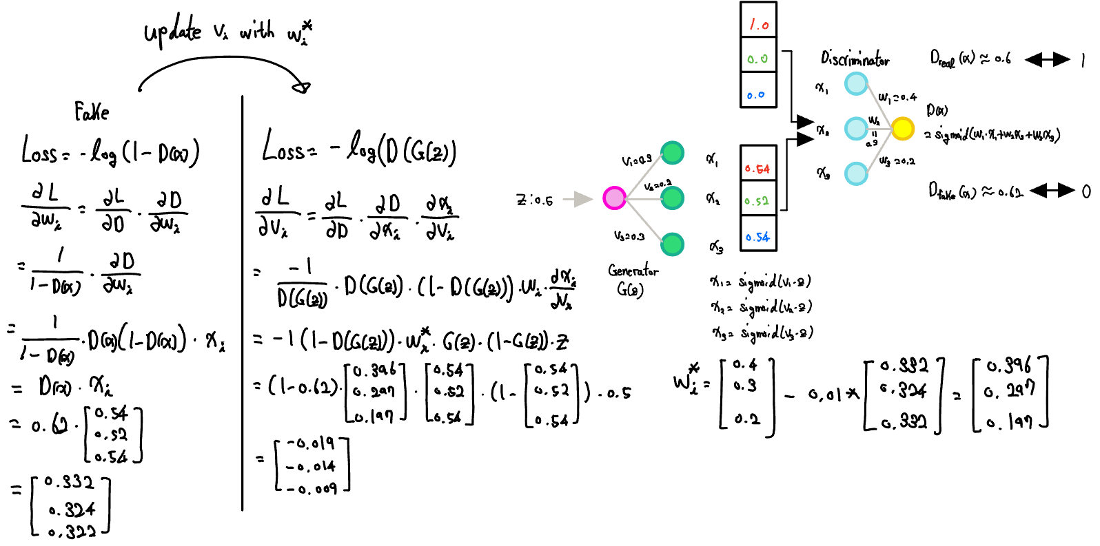 Now, let’s take a closer look at how the GAN model processes information and learns, using actual numbers for a simple example.