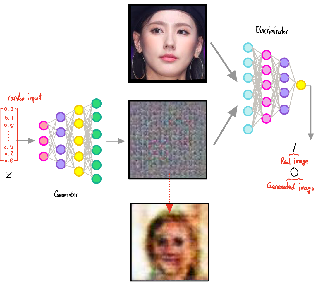 As the fake created imitations, let's assume that we have a neural network that takes a random 1-dimensional vector as input to generate a human face.