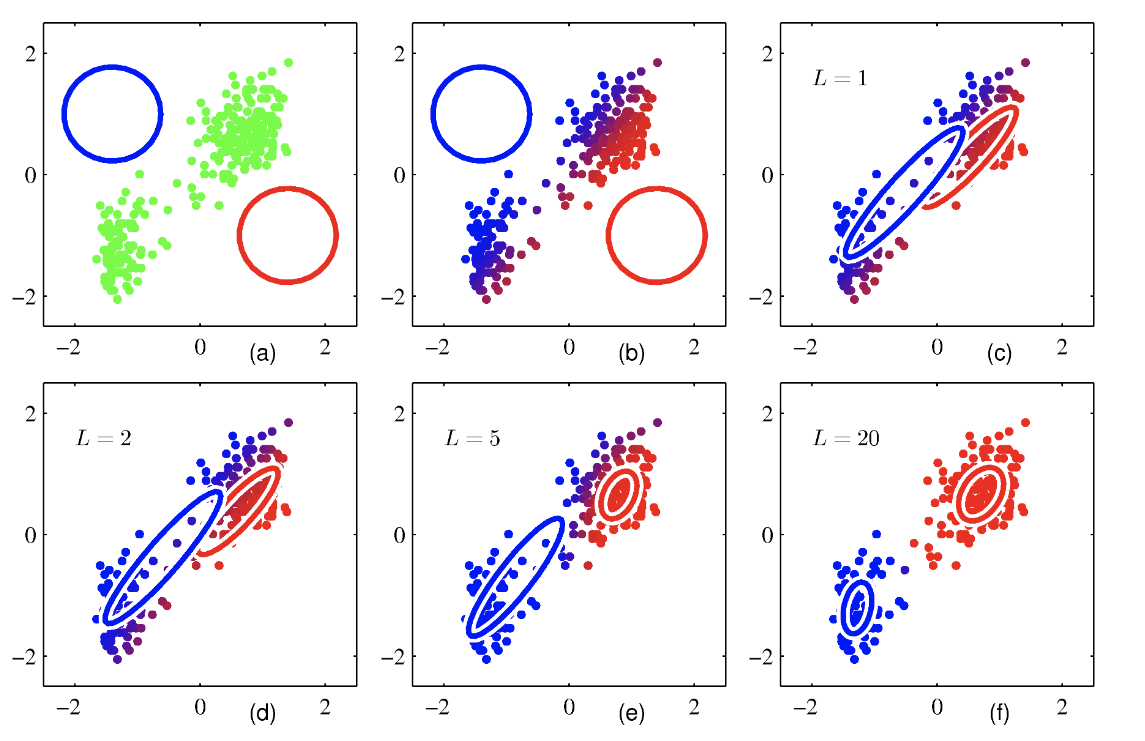 (b)에는 최초 E단계 결과를 보이고 있다. 각 데이터 포인트들은 파란색 성분과 빨간색 성분의 사후 분포 비율에 따라 파란색과 빨간색을 섞어 칠한다. 두 집단에 속할 확률이 반반이라면 보라색을 띈다.