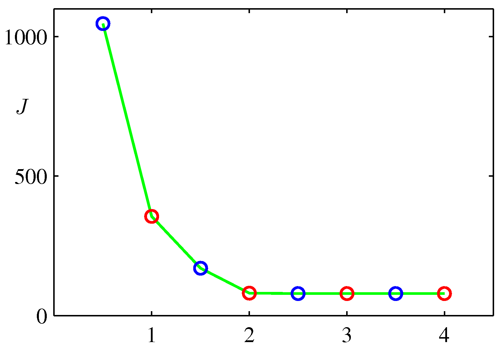 위 그림은 EM과정을 반복할 때마다 J값이 줄어드는 것을 나타내는 그림이다.