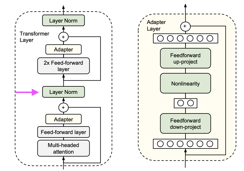 Adapter 학습과 동시에 새로운 layer-Normalization도 학습한다. 하지만 이 layer-normalization만 하게되면 성능이 좋지 않았다.