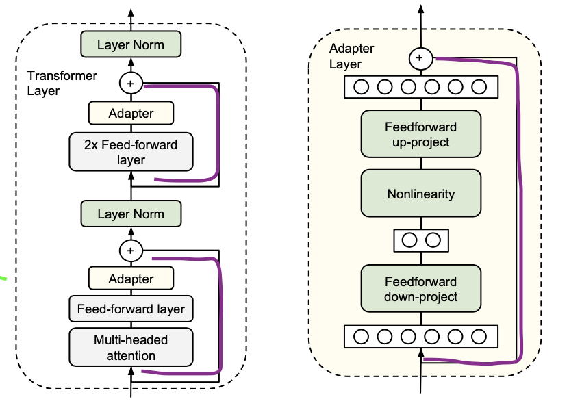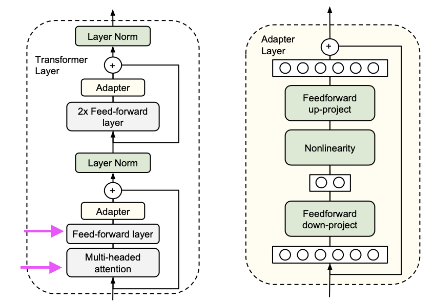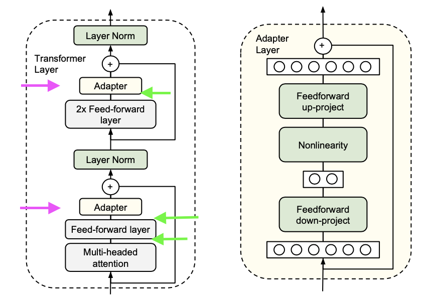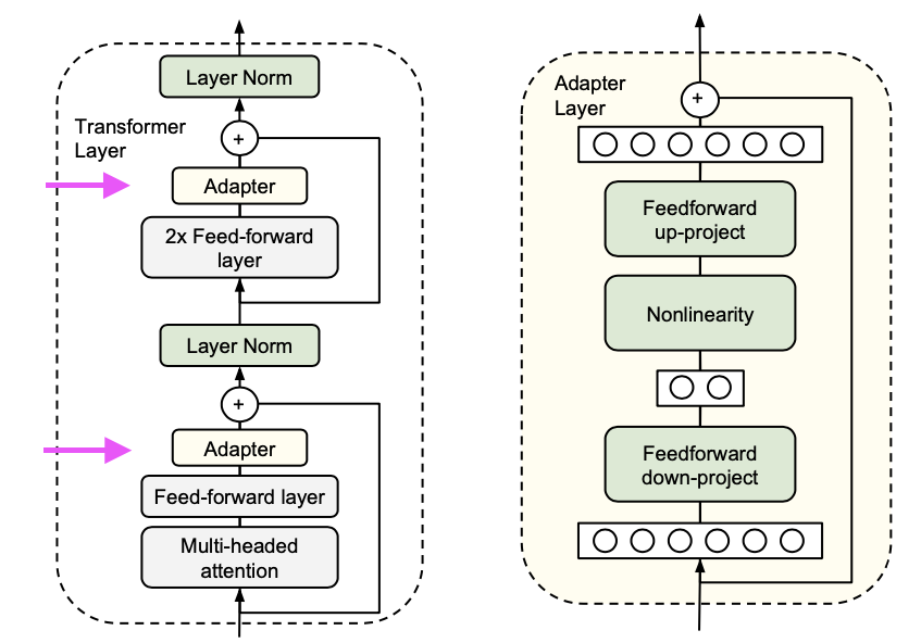 위 그림이 이 논문에서 제시한 Adapter 아키텍처이고 왼쪽은 Transformer에 적용한 것이다.