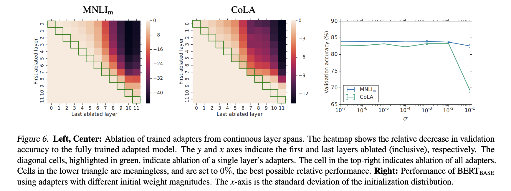 대각선 셀(녹색 칸)은 단일 계층의 어댑터만 제거했을 때 정확도 감소를 나타낸다. 각 계층이 개별적으로 얼마나 중요한지 파악할 수 있게 한다. 하지만 단일 계층만 제거 된 경우는 최대 2%만 감소했다.