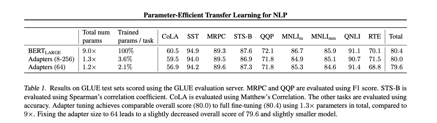 어댑터는 평균적으로 80.0점이라는 GLUE점수를 얻었다.
