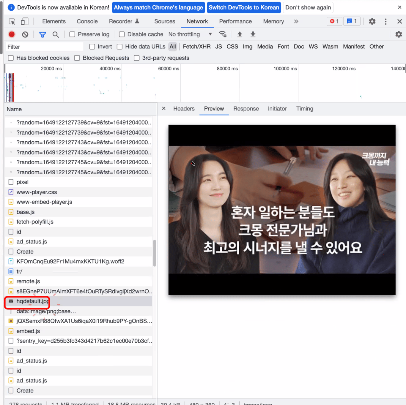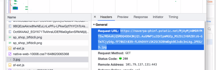 관리자 메뉴의 네트워크 탭에서 브라우저가 사진을 다운로드 받아오고 있는 것을 알 수 있다.