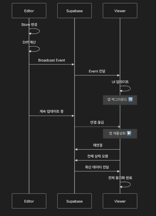 편집 정보를 주고 받는데 갑자기 웬 Postgres changes가 나오는지 의아할 수 있겠는데, 정보를 잃어버리지 않기 위한 목적이었다.