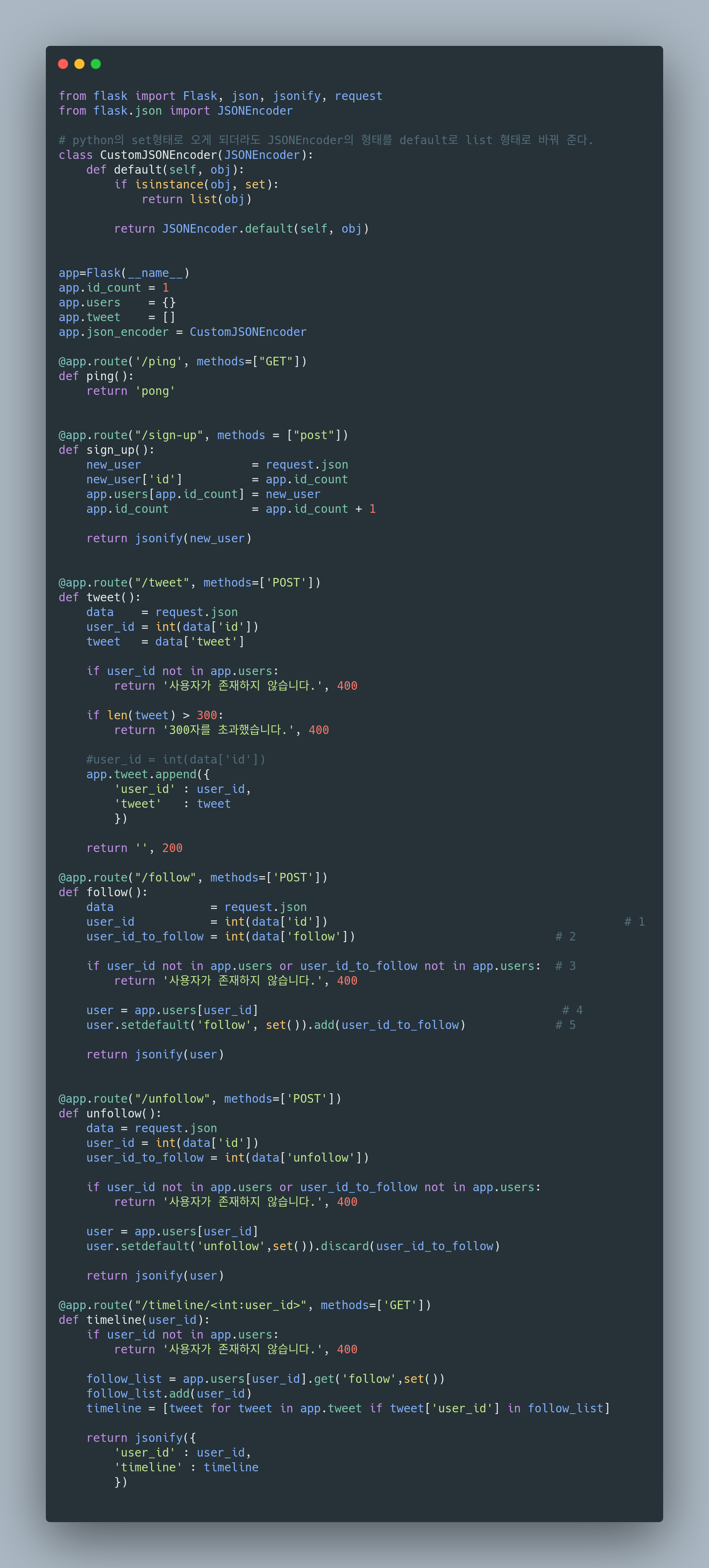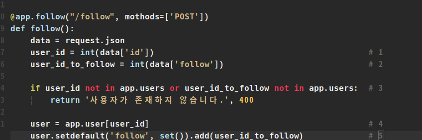 만약 읽어들인 사용자의 정보를 담고 있는 딕셔너리가 이미 follow라는 필드를 가지고 있다면, 사용자의 follow 키와 연결되어 있는 set에 팔로우 하고자 하는 사용자 아이디를 추가한다.
