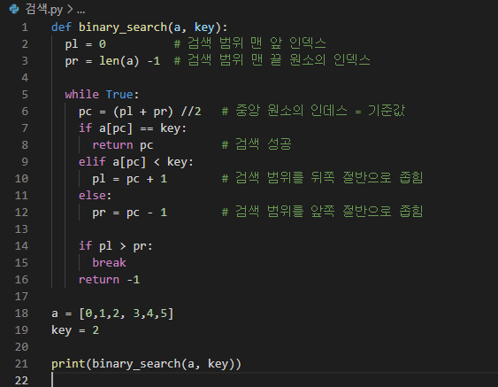 이진 검색은 원소가 오름차순이나 내림차순으로 정렬된 배열에서 좀 더 효율 적으로 검색할 수 있는 알고리즘 입니다.