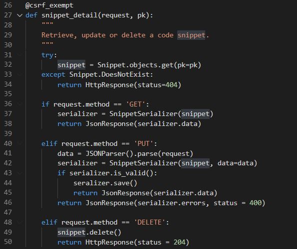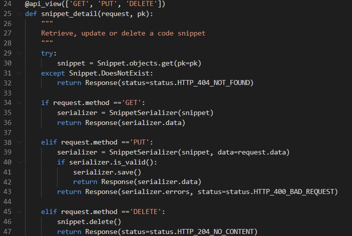 🔽수정된 코드🔽Our instance view is an improvement over the previous example. It's a little more concise, and the code now feels very similar to if we were working with the Forms API. We're also using named status codes, which makes the response meanings more obvious.