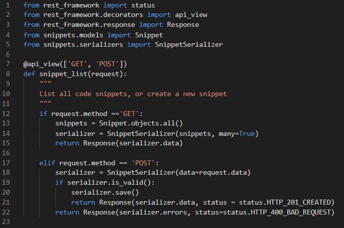 Using numeric HTTP status codes in your views doesn't always make for obvious reading, and it's easy to not notice if you get an error code wrong. REST framework provides more explicit identifiers for each status code, such as HTTP_400_BAD_REQUEST in the status module. It's a good idea to use these throughout rather than using numeric identifiers.