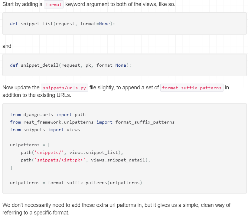 To take advantage of the fact that our responses are no longer hardwired to a single content type let's add support for format suffixes to our API endpoints. Using format suffixes gives us URLs that explicitly refer to a given format, and means our API will be able to handle URLs such as http://example.com/api/items/4.json.