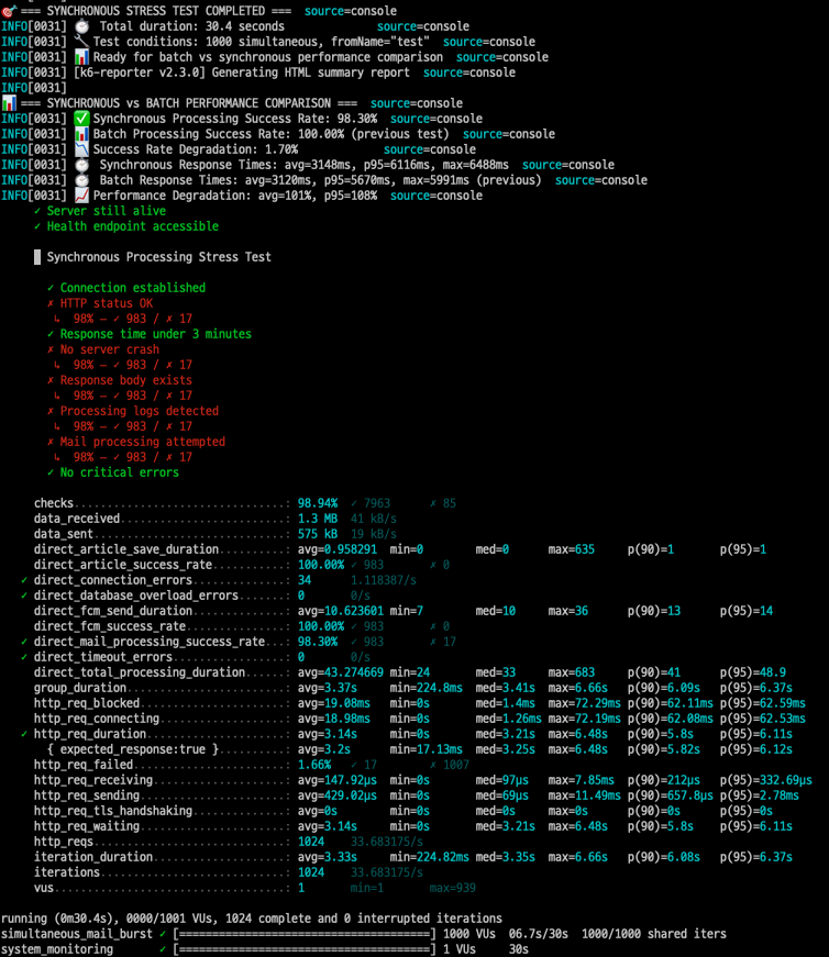 NEWZET 서비스에서 대규모 이메일 수신은 빈번하게 일어난다. 특히 뉴스레터 서비스 집합소라는 특성상 동시에 수많은 이메일을 처리해야 하는 시스템이라 성능 최적화 반드시 필요했다. 1000개 동시 이메일 처리라는 환경에서 성공률 100프로를 달성하고싶어 팀원들에게 통보(?)를 하고 무작정 부하테스트를 진행해봤다.