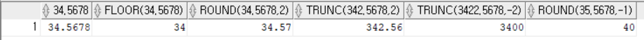 select 34.5678,floor(34.5678),round(34.5678,2),trunc(342.5678,2),trunc(3422.5678,-2),