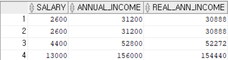 (salary*12)-(salary*12*0.01) real_ann_income from employees;로