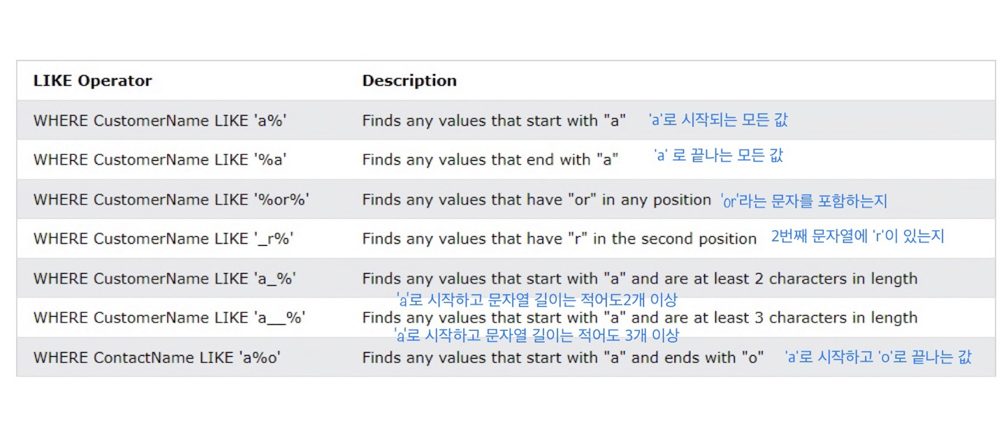 WHERE절에 주로 사용되며 부분적으로 일치하는 칼럼을 찾을때 사용