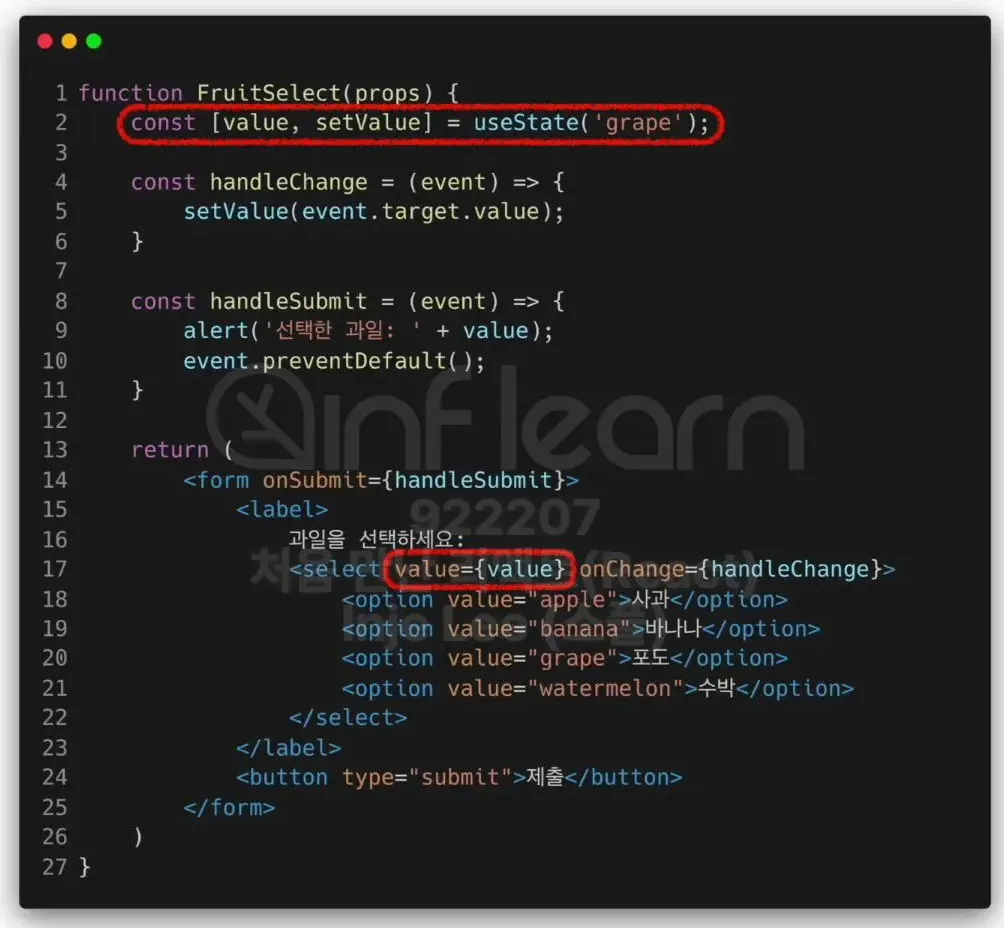 value attribute를 통해 state 값을 전달하고,