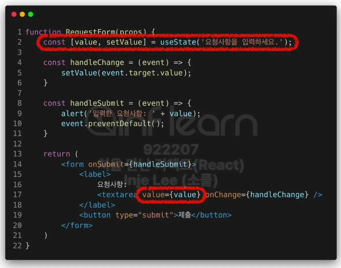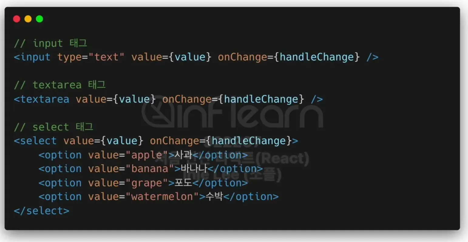 input, textarea, select 태그를 Controlled Component로 만드는 방법은 모두 비슷함.
