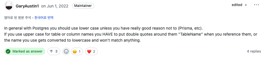 그 이유가 Supabase는 PostgreSQL을 기반으로 하는데 PostgreSQL의 경우 tables, columns, functions 등의 모든 이름을 소문자로 바꾸기 때문이라고 한다.-> 참고