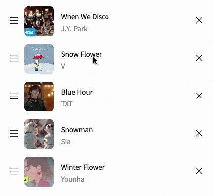 provided.innerRef : 위의 Droppable의 설명과 동일합니다.provided.draggableProps : Draggable 컴포넌트의 드래그 속성을 설정하는 데 사용됩니다. 이 속성에는 드래그 가능한 요소에 대한 이벤트 리스너와 스타일 등이 포함됩니다. 예를 들어, onDragStart, onDragEnd, style 등을 설정할 수 있습니다.provided.dragHandleProps : 드래그 가능한 요소의 핸들(드래그를 시작할 수 있는 영역)에 대한 속성을 설정하는 데 사용됩니다. 이를 통해 드래그 가능한 요소를 특정 영역에서만 드래그할 수 있도록 제한할 수 있습니다.PlayList와 PlayListItem이 컴포넌트로 되어있어 전달해줘야할 것들을 props로 보내주었고, 아래의 코드처럼 받은 props를 적용해주었습니다.