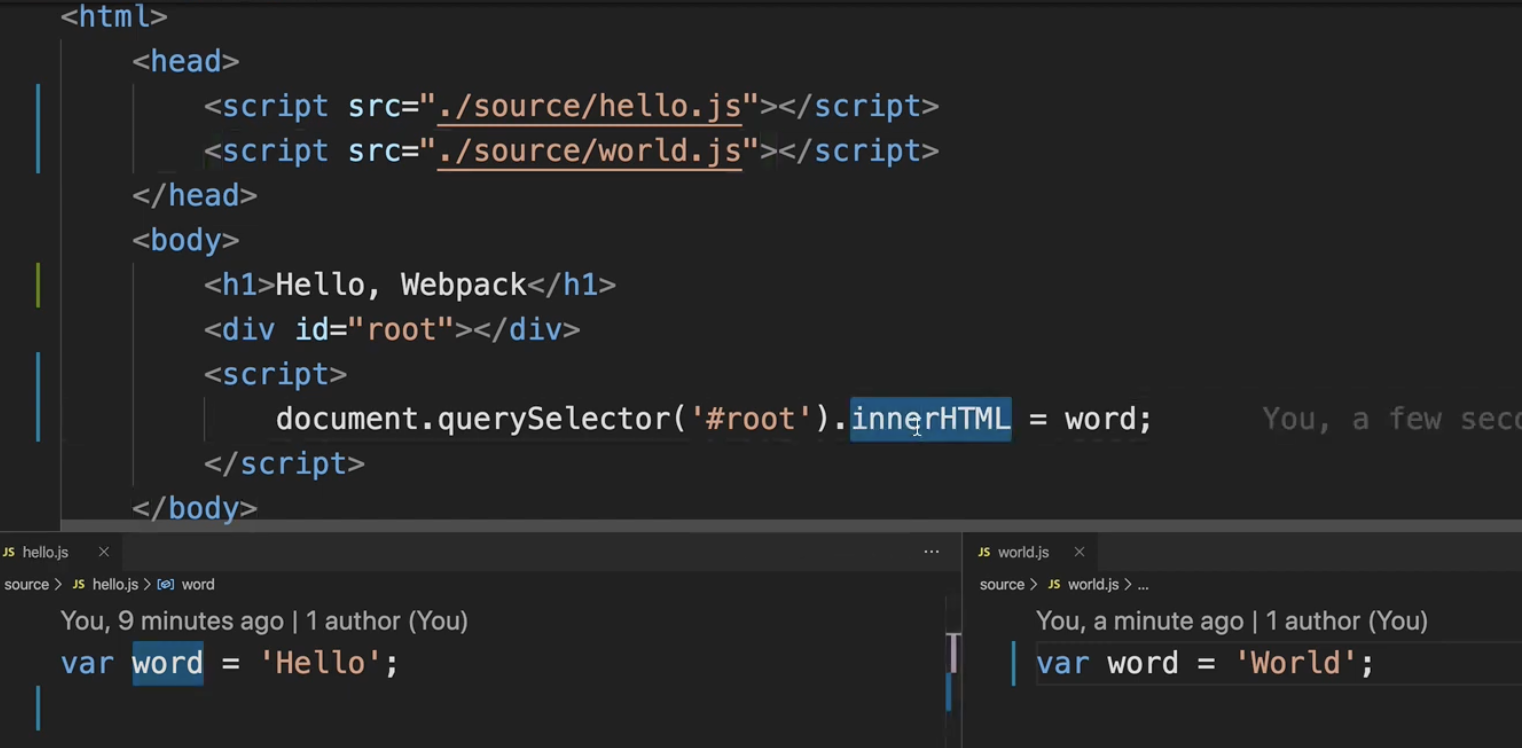 스크립트가 순차적으로 실행될 때, 별개의 자바스크립트 파일에서 불러왔지만 변수이름이 충돌해 아래 파일(word.js)의 값으로 덮어 씌어진다. 스크립트를 분리해도, 파일을 분리해도 var로 선언된 word 변수는 전역 변수가 되기 때문이다.