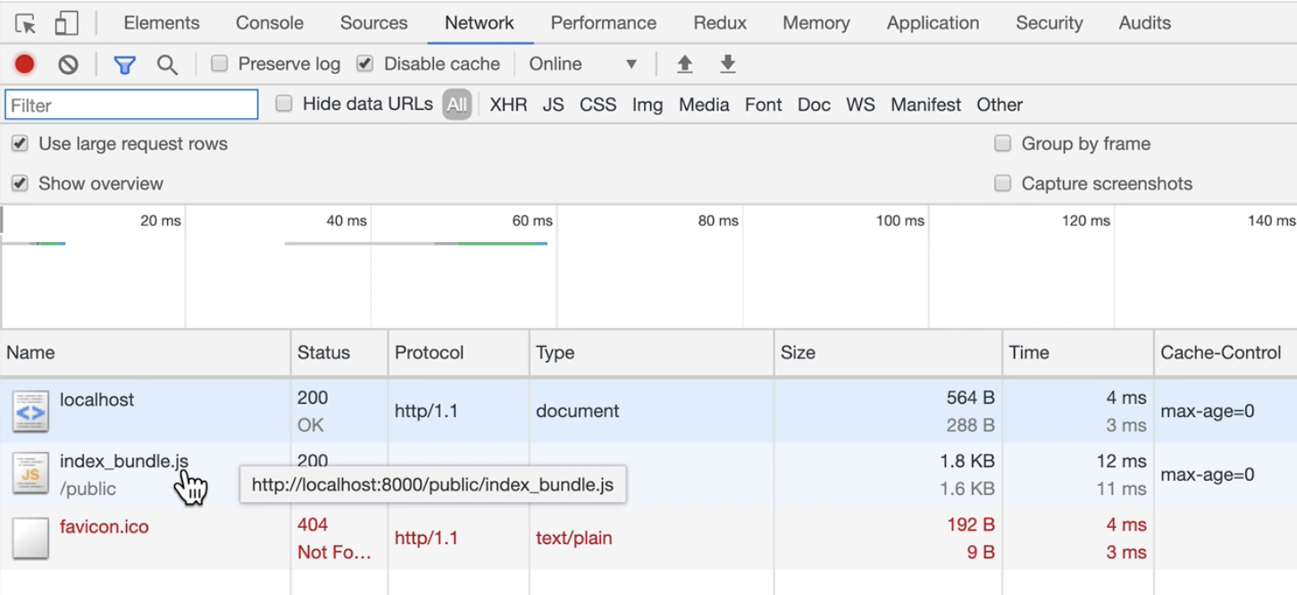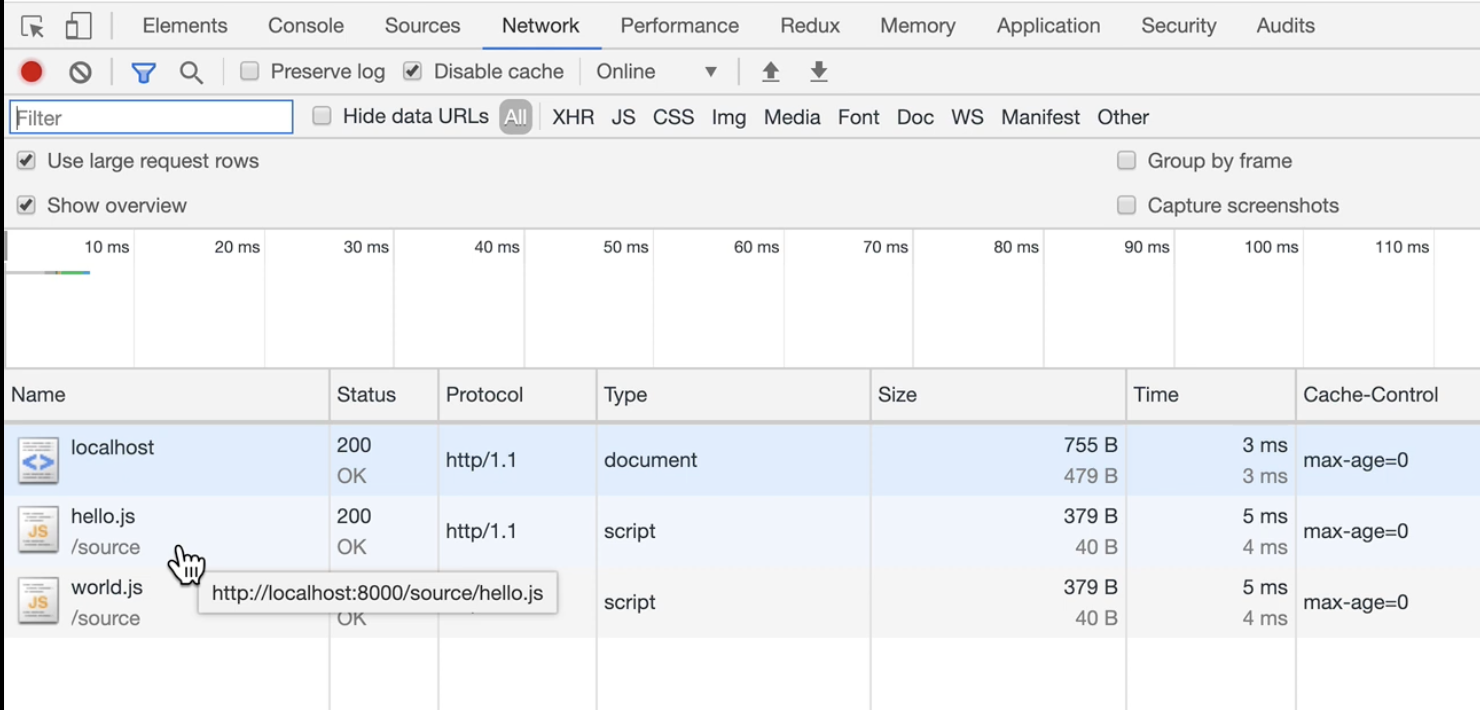 // 웹팩을 이용해 번들링한 파일을 네트워크 탭에서 확인하는 화면