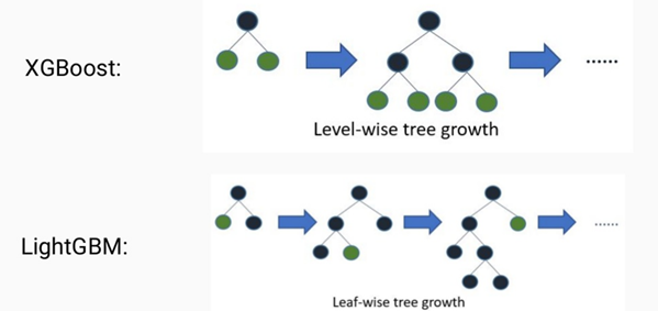 XGBoost의 경우, split하기 위한 best possible node를 찾으며, 전체적인 트리의 깊이를 줄이고 균형있게 만들기 위해서 root 노드와 가까운 노드를 우선적으로 순회하여 level-wise한 성장
