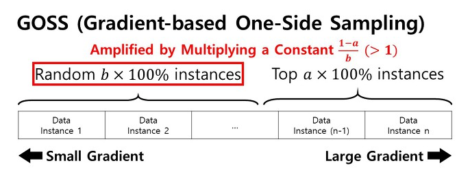 전통적인 Gradient Boosting Algorithm의 경우, 각 변수마다 가능한 모든 분할점에 대한 information gain을 평가하려면, feature 즉, data instance를 모두 살펴봐야하는데 이를 위해 많은 시간이 소요됨
