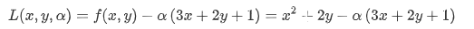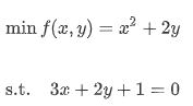 다음의 등식 제약의 조건하에서 f(x,y)를 최소화하는 x,y를 찾는 문제