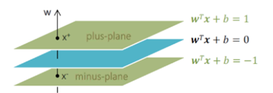 Plus plane, Minus plane 사이의 거리인 마진(margin)을 최대화하는 분류 경계면