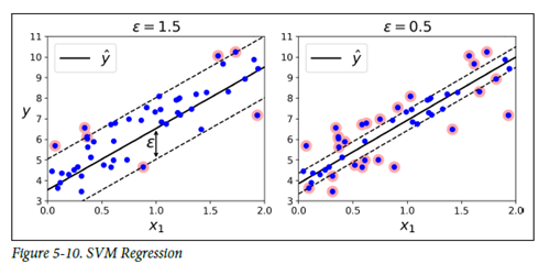 회귀에 SVM을 적용하는 메커니즘 : 일정한 마진 오류 안에서 두 클래스 간의 도록폭이 가능한 최대가 되게 하는 동시에, 도로 안에 가능한 많은 샘플이 들어가도록 학습