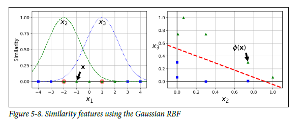 각 샘플이 특정 랜드마크와 얼마나 닮았느지 측정하는 유사도함수로 게산한 특성을 추가하여 비선형 특성을 다룰 수 있음.