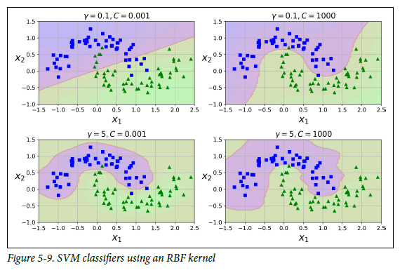작은 gamma값은 넓은 종모양 그래프를 만들어 샘플이 넓은 범위에 걸쳐 영향을 주므로, 부드러운 결정 경계