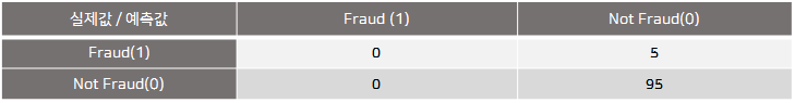 Accuracy Paradox : 5번의 사기사례를 단 한번도 예측하지 못함에도, 95%의 accuracy를 보이는 문