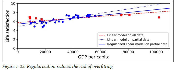 규제(regularization) ex) 선형 모델의 경우 기울기를 0이 되도록 강제하면 평균에 가까워짐