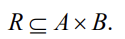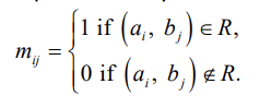 A X B의 부분집합 R에 대해서 (a,b)가 R에 속해있으면, 행렬에서 1로 표현,