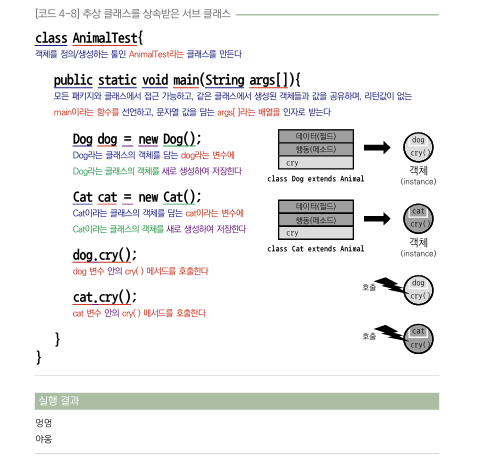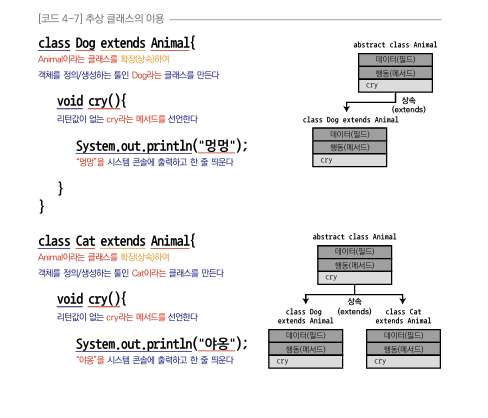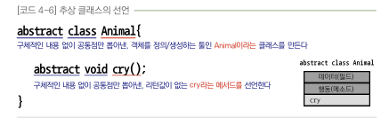 • 이처럼 자바에서 ‘추상 클래스’란 다른 클래스들의 공통이 되는 변수나 메서드의 이름과 형태만 기술해 놓았을 뿐 구체적인 내용이 없는 클래스입니다