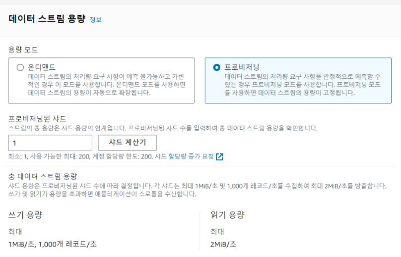저의 경우 꾸준한 중~대규모 트래픽의 경우를 생각하여 용량 모드를 프로비저닝 모드로 했지만, 실습을 위해 잠깐의 데이터만 수집한다면 사용량에 따라 비용을 내는 온디맨드 방식을 선택해주시면 됩니다.