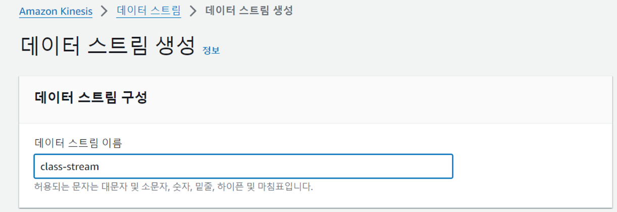 우선 데이터 수집을 위한 Kinesis Data Stream을 생성해줍시다.
